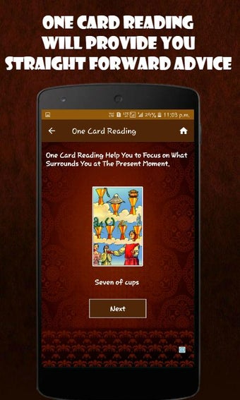 La aplicación incluye diversas modalidades de lectura como la lectura de una carta, tres cartas y lecturas enfocadas en el amor. Los usuarios pueden recibir consejos y guía espiritual, ayudando a tomar decisiones y reflexionar sobre su vida personal. Todo esto se ofrece sin costo alguno, facilitando el acceso a una herramienta de autoconocimiento y crecimiento personal.
